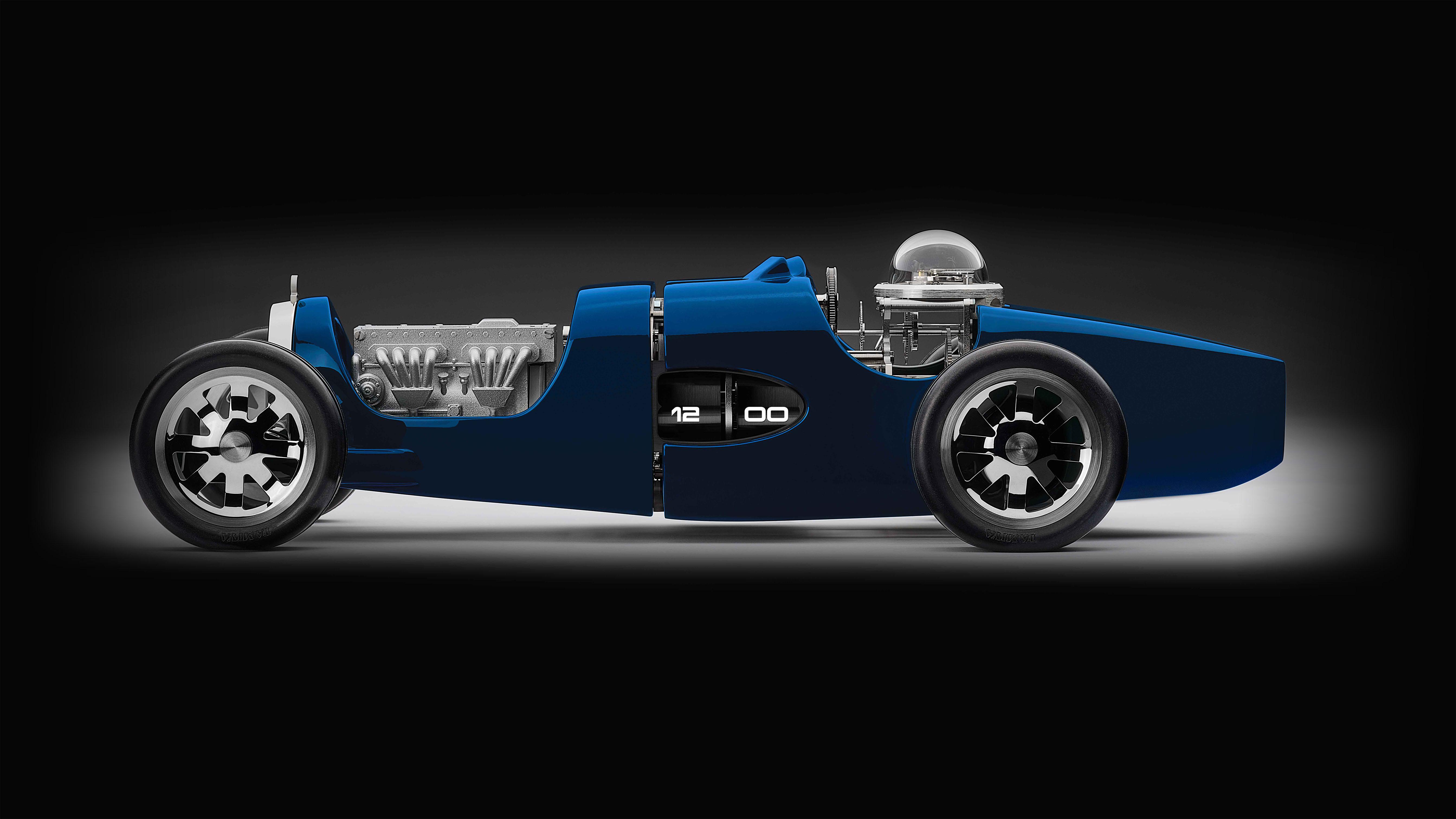 The mechanics of the TF35 consists of an in-house movement with an 8-day power reserve, which melds seamlessly to the curves of the aluminum bodywork. In a subtle nod to vintage toy cars of our childhood, winding the mechanical motor is done by turning the rear wheels, just like a pullback car.