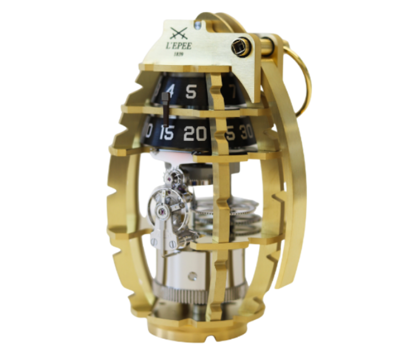 Grenade is modelled after the historical MKII grenade with an M6A4C fuse that uses a pin that is pulled to activate the explosive. In a similar way, the L’Epée 1839 Grenade features a pin that doubles as the key, which when pulled allows for setting the time and winding the eight-day movement. The moment you pull the pin on a grenade the mind is focused: the grenade is live, and you must concentrate on the here and now to survive.